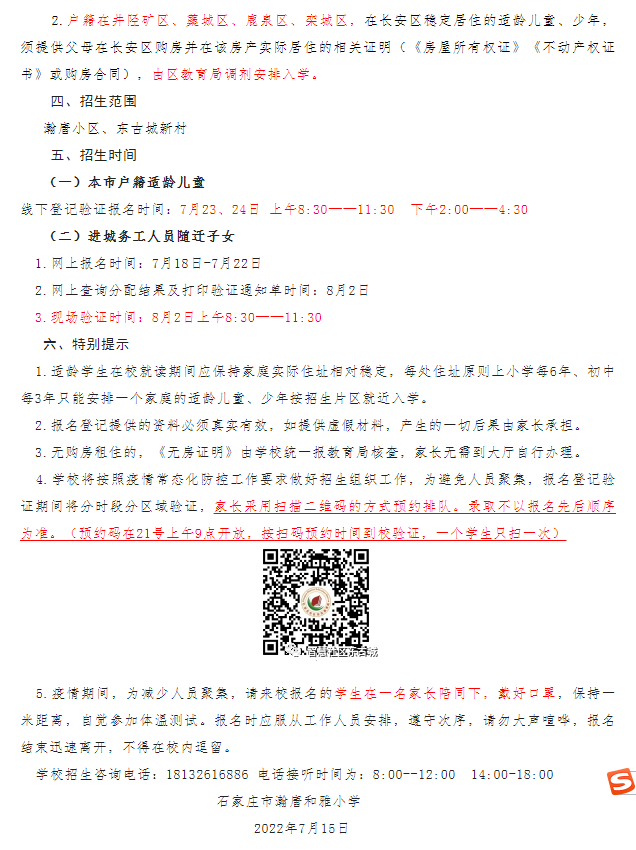 2022年石家庄市长安区瀚唐和雅小学招生简章,含招生咨询电话