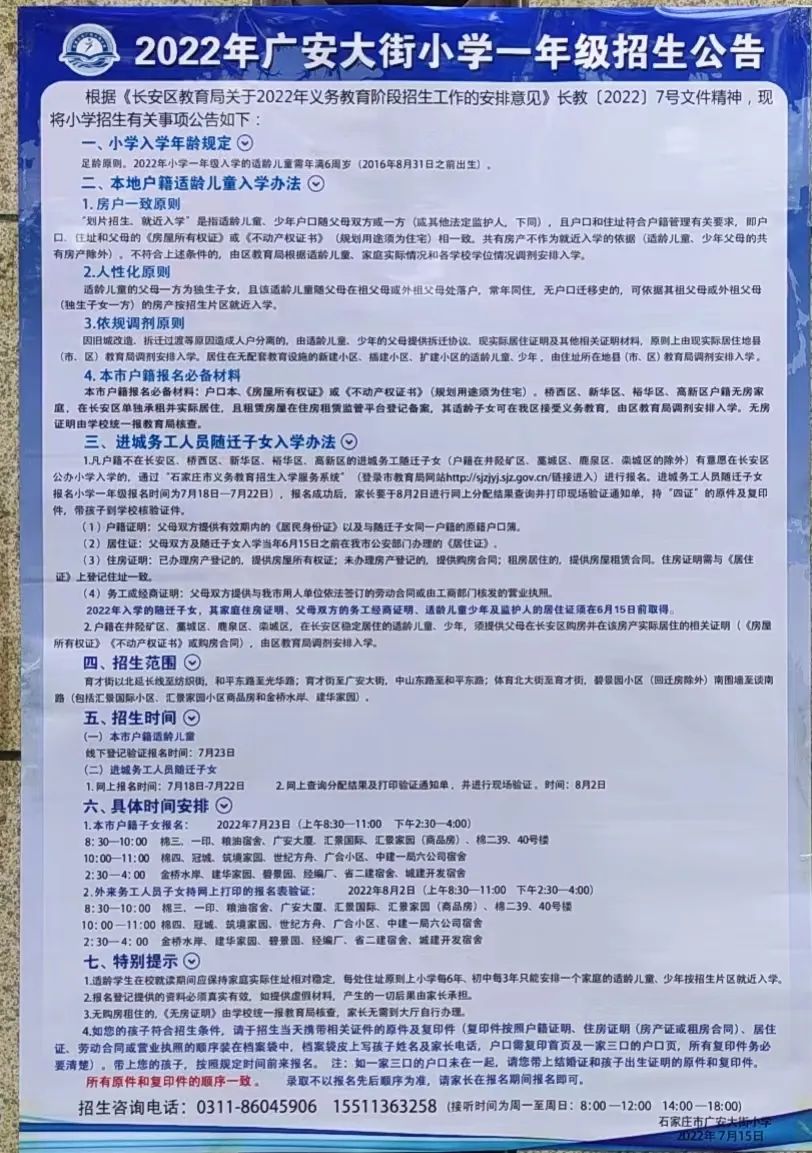 2022年石家庄市长安区广安大街小学招生简章,含招生咨询电话