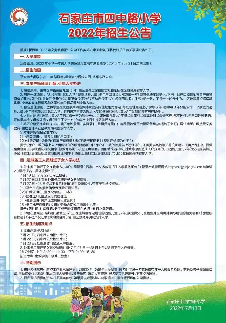 2022年石家庄市四中路小学招生简章,含招生咨询电话和小学学区范围施教区范围划分