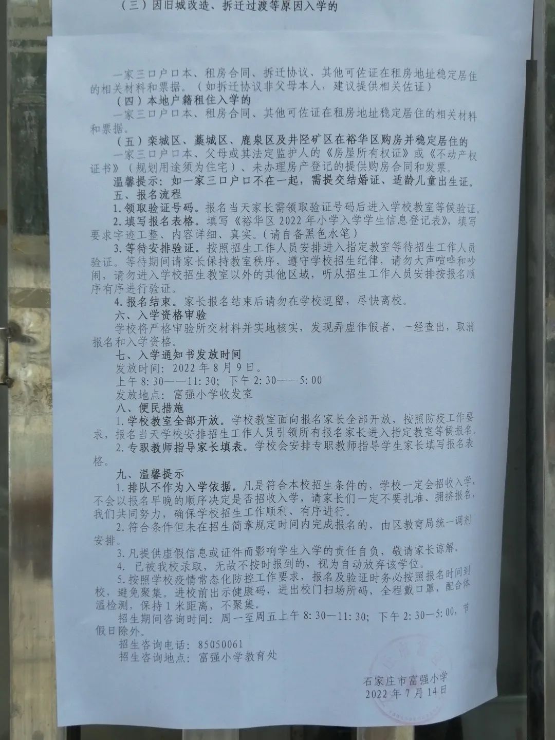 2022年石家庄市富强小学招生简章,含招生咨询电话和小学学区范围施教区范围划分