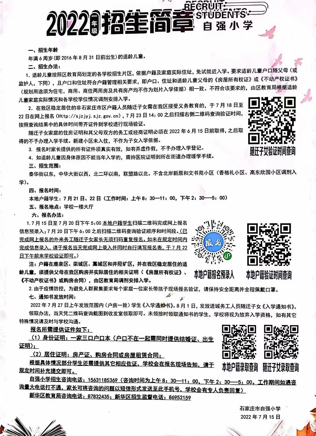 2022年石家庄市自强小学招生简章,含招生咨询电话和小学学区范围施教区范围划分