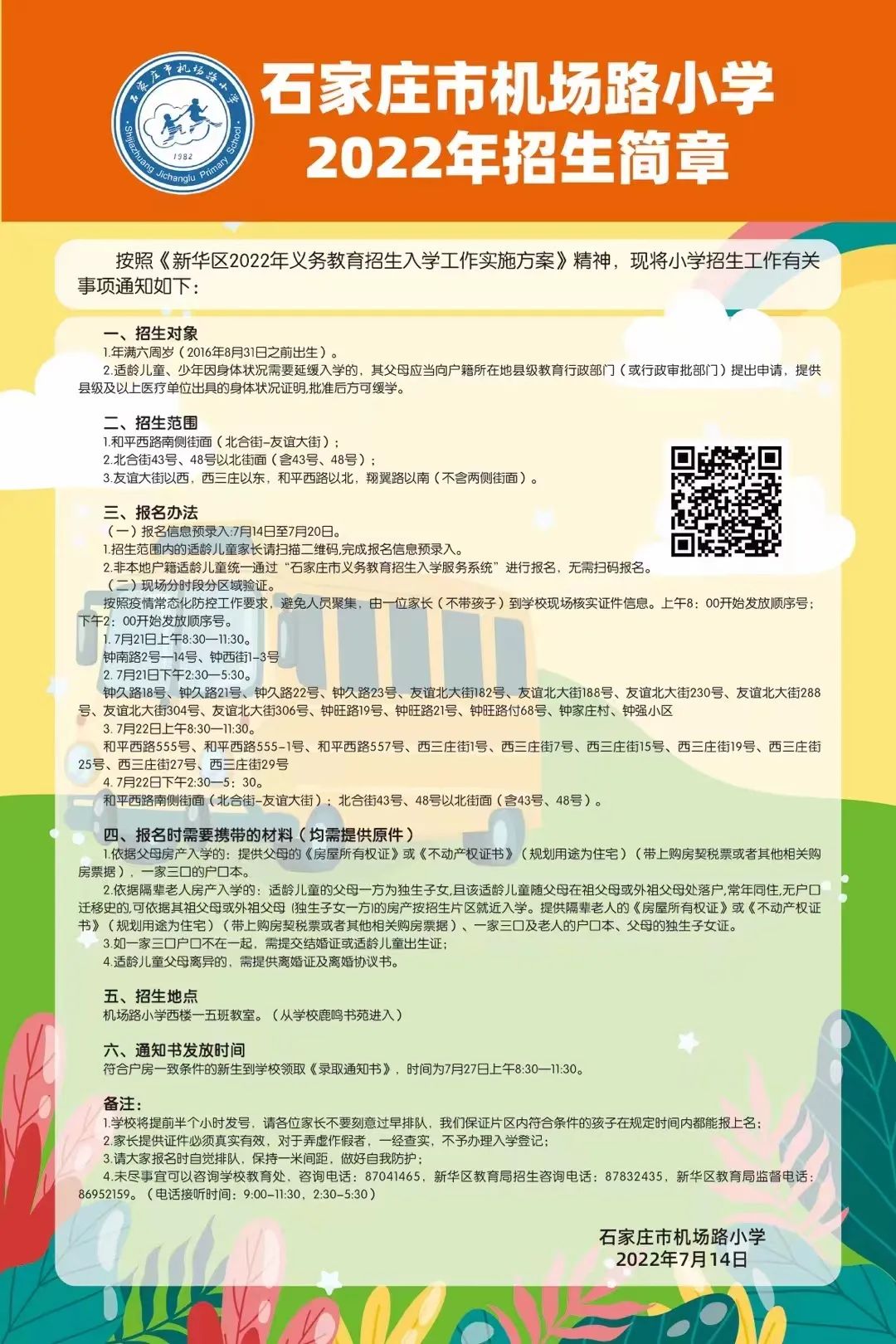2022年石家庄市机场路小学招生简章,含招生咨询电话和小学学区范围施教区范围划分