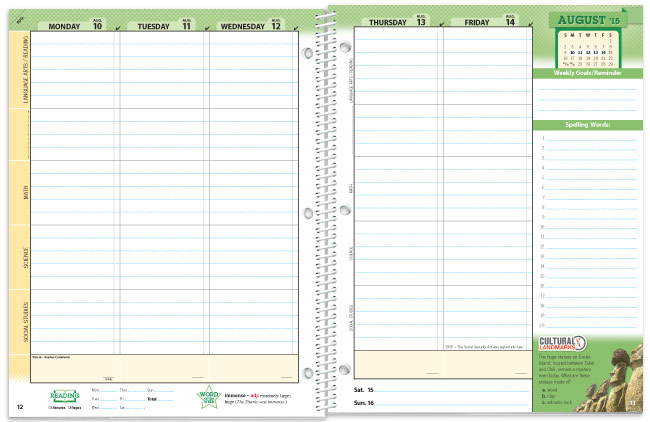 加拿大小学开学初期,老师会给家长们发一份文具采购单,按照上面的要求,家长们买好所有的文具后,送到学校保管,全班孩子共同使用。今年的采购单上,多了一条:小学生计划册。类似于下图的这种计划册,从每一学年的8月到第二学年的7月。