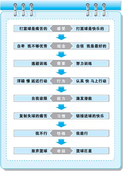 最终,那个进一个球的孩子在自传中写到:就是因为我找到了那一个进球的快乐,并且不断地和快乐链接,才对篮球有了浓厚的兴趣。而那个放弃的人是因为找到了那一个没进的球的痛苦,不断和痛苦链接,于是选择了放弃。那个只进了一个球的人就是迈克尔·乔丹。
