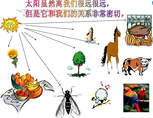 太阳虽然离我们很远很远,但是它和我们的关系非常密切。有了太阳,地球上的庄稼和树木才能发芽,长叶,开花,结果;鸟兽、虫、鱼才能生存,繁殖。如果没有太阳,地球上就不会有植物,也不会有动物。我们吃的粮食、蔬菜、水果、肉类,穿的棉、麻、丝,都和太阳有密切关系。埋在地下的煤炭,看起来好像跟太阳没有关系,其实离开太阳也不能形成。因为煤炭是由远古时代的植物埋在地层下变成的。