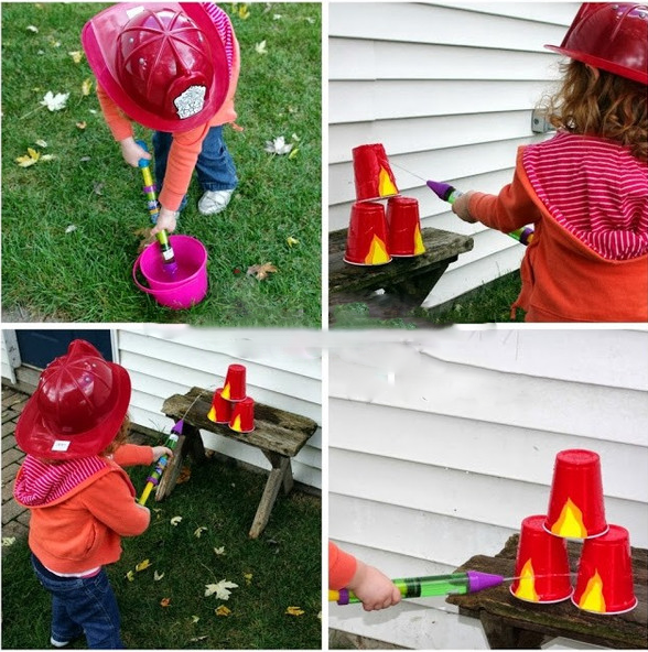 玩法2:三个一次性杯子画上火苗的图案,用滋水枪灭火!