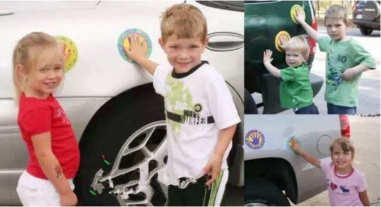 玩法:在车上贴上有手掌图案的贴纸,引导孩子下车之后要和车的小手击掌,直到爸爸妈妈下车。