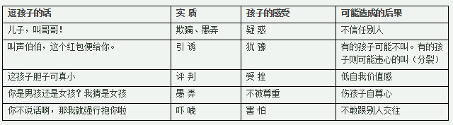以这个案例为例,我用图表的形式来分析“逗”孩子的实质、孩子的感受及可能造成的后果: