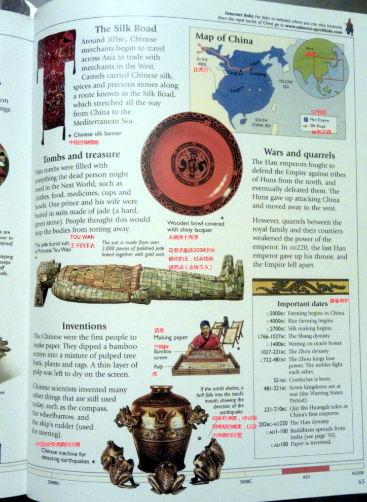 大约在公元前105年,中国的商人开始跨过亚洲来和西方的商人交易,骆驼带着中国丝绸、香料和珍稀玉石,沿着一条称为“丝绸之路”的道路行走,“丝绸之路”从中国一直延伸到地中海。