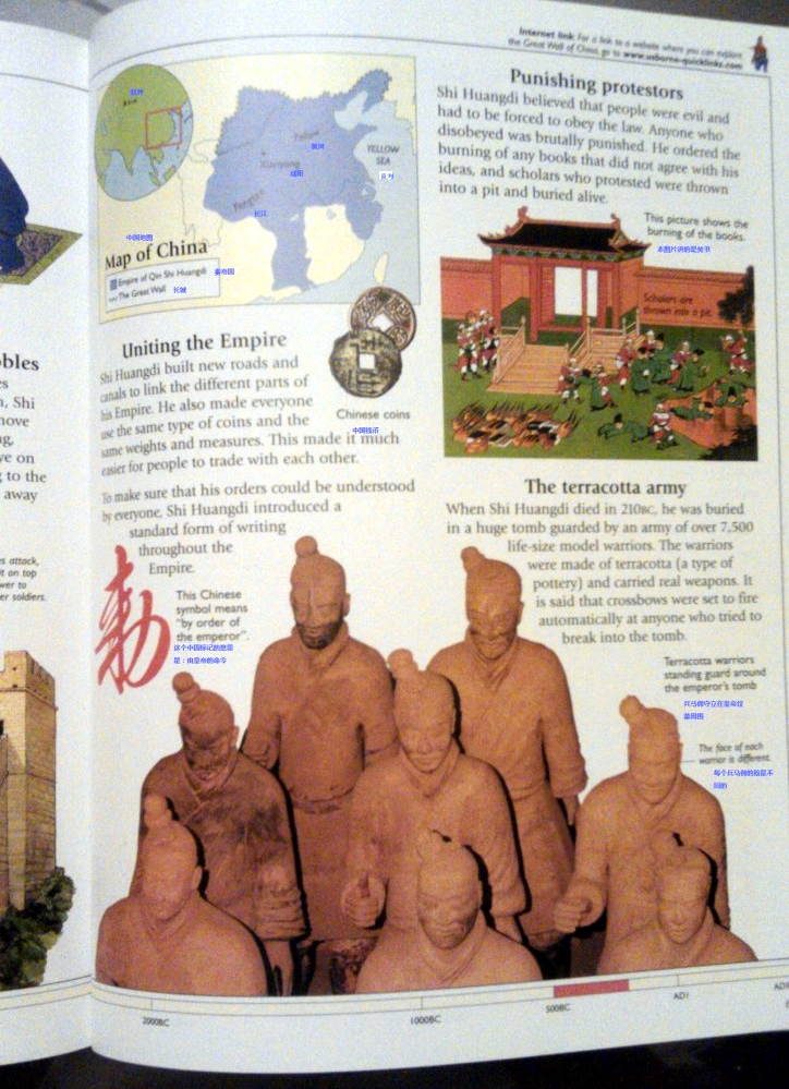 到了大约公元前480年,中国是由七个王国组成,这七个王国之间常年战乱,到了公元前221年,秦国(音chin)征服了所有其它王国,秦王控制了一个巨大的帝国,他称自己为“秦始皇”,意为“中国的第一个皇帝”。