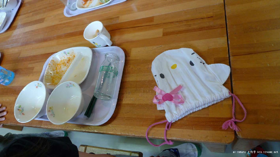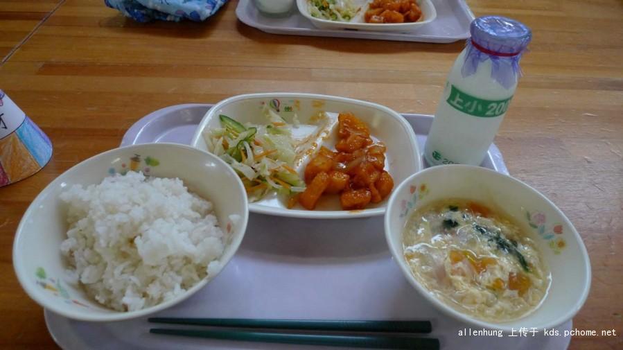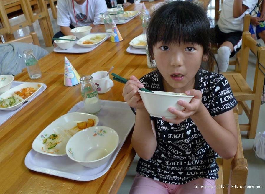 看看日本小朋友吃饭的样子,很努力的吃,汤已经一滴不剩了,菜也快吃完了。