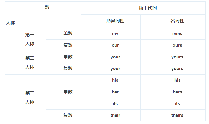 说明:英语物主代词是表示所有关系的代词。物主代词可分为形容词性物主代词和名词性物主代词。详见下表: