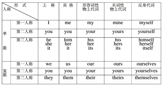 英语人称代词是用来表示“我”、“你”、“他”、“她”、“它”、“我们”、“你们”、“他们”的代词。英语人称代词有单复数和主宾格的变化。详见下表: