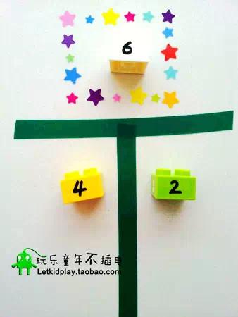 普通的加法算式,用手工材料去呈现别有一番趣味,有趣是2个数字之和的区域用星星贴纸围起来,很有那种做出答案的成就感呢!