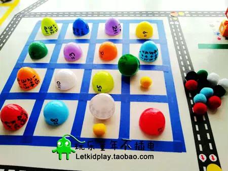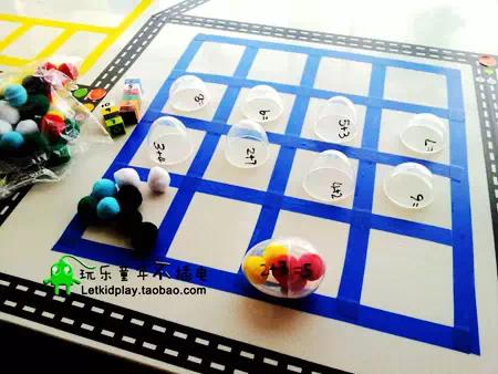 有油性笔勾线笔在透明蛋外面写上加法算式,比如3+4=,让孩子用2种颜色的毛球来代表,3个红色和4个黄色的,一起放到透明蛋。然后把答案写在蛋的另外一半吧。