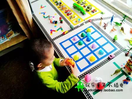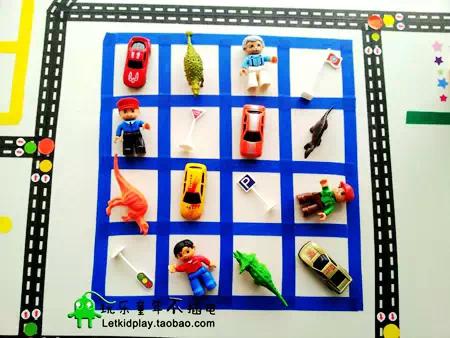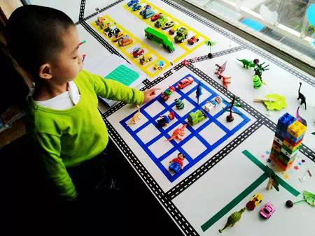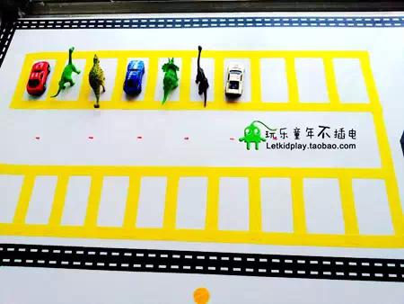 先用彩色胶带粘好如图的格子,然后找出两种不同的玩具,如上图,动物和交通工具,这是一个ABB,ABB的循环组合,然后后面的空白格子留给孩子去摆。