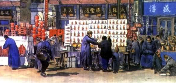 从腊八起,铺户中就加紧的上年货,街上加多了货摊子——卖春联的、卖年画的、卖蜜供的、卖水仙花的等等都是只在这一季节才会出现的。这些赶年的摊子都教儿童们的心跳得特别快一些。在胡同里,吆喝的声音也比平时更多更复杂起来,其中也有仅在腊月才出现的,象卖宪书的,松枝的、薏仁米的、年糕的等等。