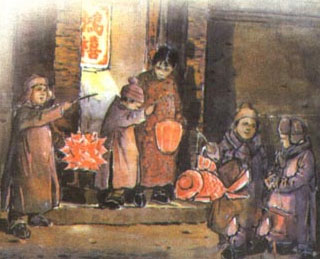 小孩子们买各种花炮燃放,即使不跑到街上去淘气,在家中照样能有声有光的玩耍。家中也有灯:走马灯——原始的电影——宫灯、各形各色的纸灯,还有纱灯,里面有小铃,到时候就叮叮的响。大家还必须吃汤圆呀。这的确是美好快乐的日子。