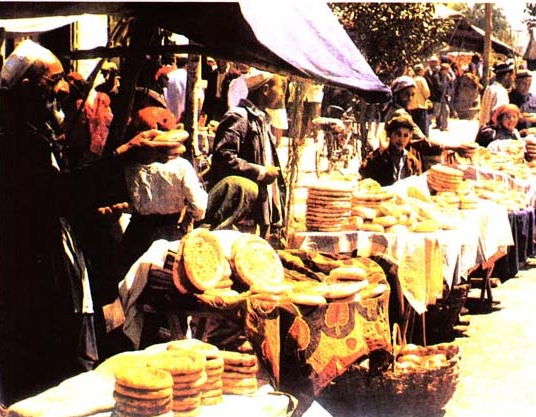 和田维吾尔崇拜土地的程度令人惊叹。如果不是亲眼所见,亲口品尝,谁能想象那黄灿灿、香气四溢的烤肉是从土馕坑里烤制而成的,谁又能想到维吾尔人一年四季的大众食品——馕,无一不是从古堡似的土馕坑烧制而出的。大漠深处的维吾尔牧人还特别喜食沙土灰里烧出的“库乃其”。他们先在沙土里挖个坑,捡来一些干胡杨树枝在沙坑里燃起一堆火,待大火灭了之后,就把包肉的面饼埋在火灰中烤熟即食。吃了这种“库乃其”,据说一天不吃饭也浑身有劲儿。