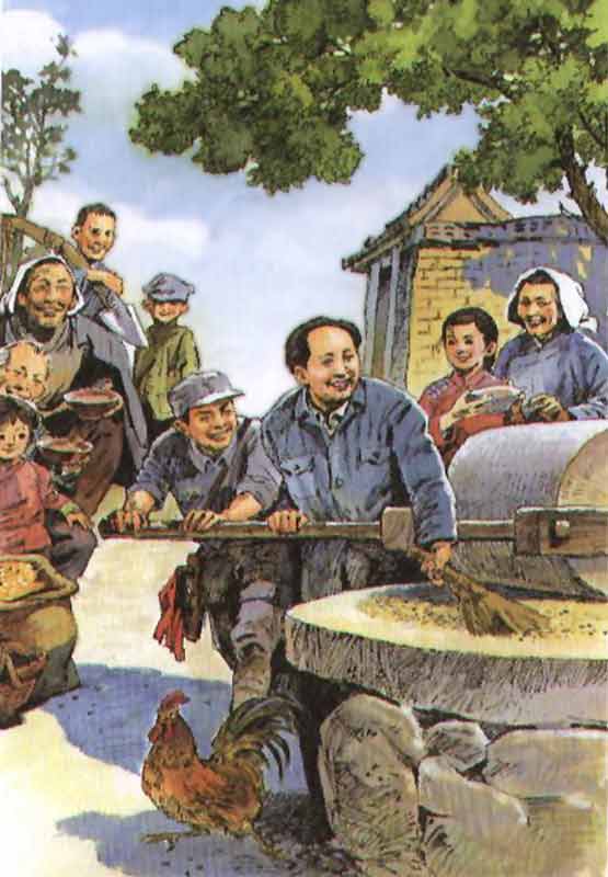 这时候,毛主席来了,喝茶水的乡亲们纷纷跟毛主席打招呼。毛主席笑着向大家点头,说:“要说喝茶的好处,确实不少嘛,喝了它浑身有精神,还能让人多吃饭……”毛主席给乡亲们说起喝茶的好处,正在推碾子的大娘和小姑娘越推越慢,转到毛主席身边,便停了下来。毛主席舀了两碗茶水送到她们母女手里,说:“你们俩歇会儿吧!”然后对警卫员说:“来,咱俩试试,半年多不推这玩意儿了。”毛主席推碾子还挺在行,一边推,一边用笤(tiáo)帚往碾盘里扫碾出来的的玉米碎粒。一位老人细细端详着毛主席,说:“这位首长,好像在哪儿见过。在哪儿呢?”