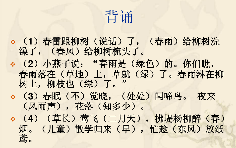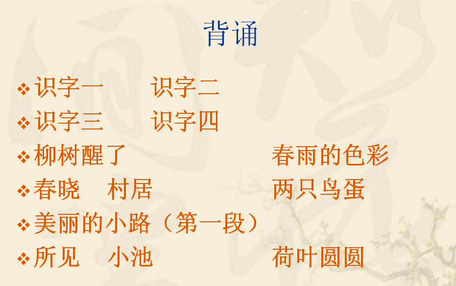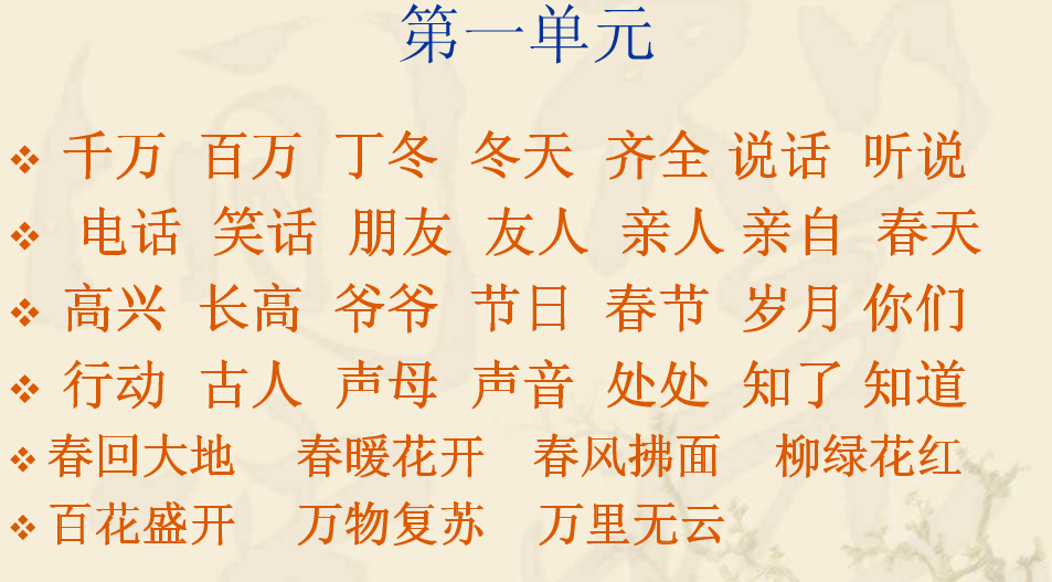 识字1:千万 复苏 柳绿花红 莺歌燕舞 冰雪 泉水 丁冬 百花齐放 百鸟争鸣