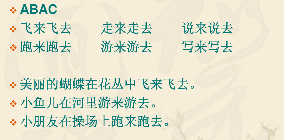 11、A来A去:飞来飞去、游来游去、跑来跑去、跳来跳去、想来想去、写来写去、说来说去、飘来飘去、