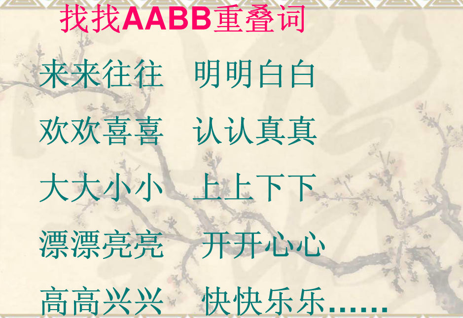 6、AABB:大大小小、干干净净、认认真真、仔仔细细、清清楚楚、马马虎虎、高高兴兴、七七八八、清清白白、山山水水、许许多多、花花绿绿