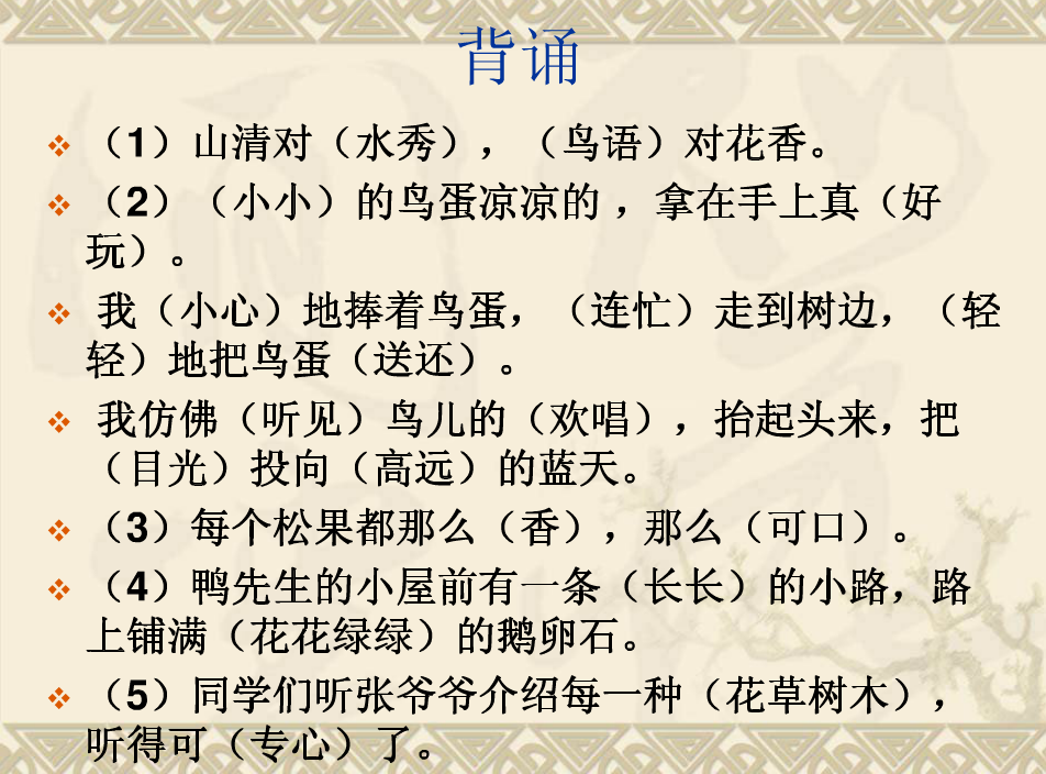 1、露出笑容、合上眼睛、透过窗帘、照顾妈妈、离开窗户、取下鸟蛋、捧着鸟蛋、走进森林、铺着鹅卵石、开着鲜花、清扫垃圾、参观植物园、领回失物、露出微笑、展开翅膀、捧起水花、闭上眼睛、睁开眼睛、掉进池塘、爬上飞机、点起灯笼、飞过假山、飞过草坪、挎起篮子、响起雷声、咬住尾巴、挣断尾巴、摇着尾巴、甩着尾巴、摆着尾巴、掌握方向、转过身子、