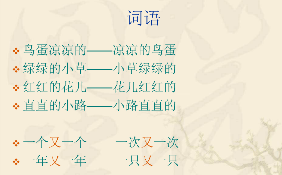 7、ABAB:打扫打扫、讨论讨论、商量商量、火红火红、提醒提醒、研究研究、许多许多、高兴高兴、一天一天、一个一个、