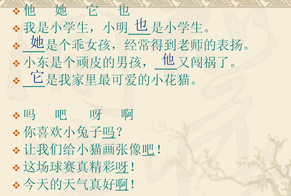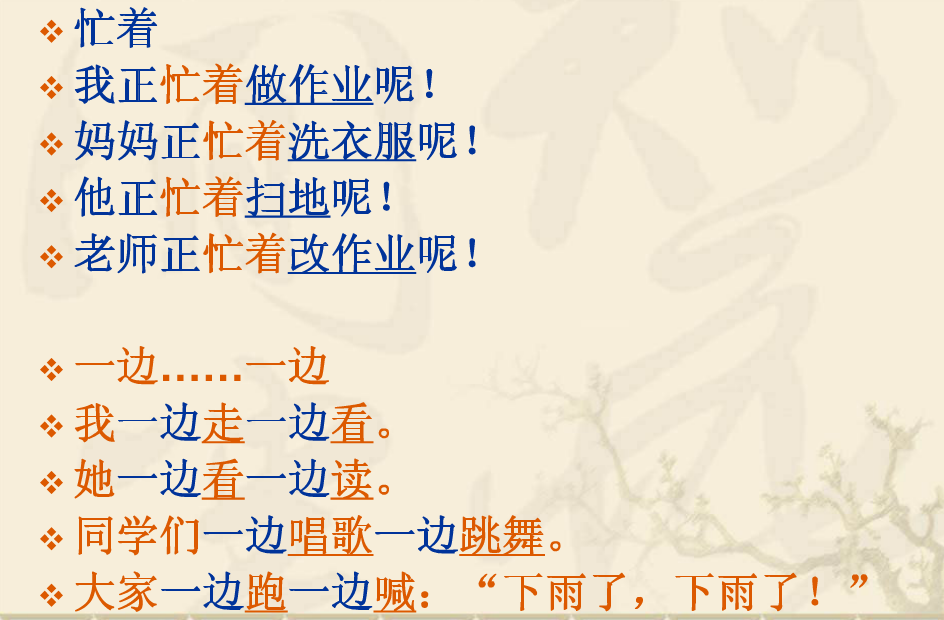 3、填土、说话、梳头、开花、吃饭、喝水、睡觉、射门、拍手、排队、抬头、散步、浇水、洗澡、展翅、结网、回家、弯腰、淋雨、下雨 文章