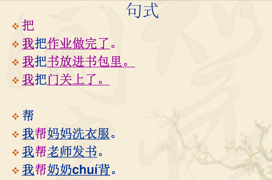 擦黑板 抄写 拾起 摔倒 拨开 拦住 抚摸