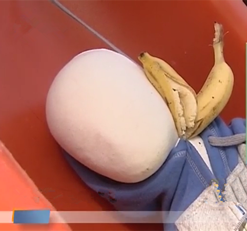 实验员将帽绳的一端放入缝隙,给模特身体绑上沙袋,使体重达到12斤,然后在模特脖子上绑了一根香蕉,让它平躺自由下滑,结果绳子勒住的一瞬间,香蕉被切成两段。