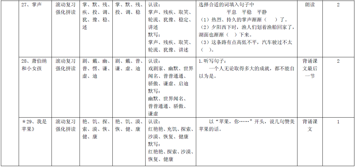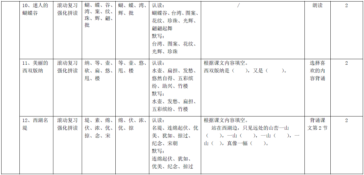 本阶段共 11 篇课文,要求孩子们能在语言环境中正确认读 108 个汉字,认识部首 3 个(“包字头”、“欠字旁”和“酉字旁”),能 在田字格里正确书写 61 个汉字,积累课后词语表中 83 个词语,努力做到正确、流利、有感情地朗读课文。