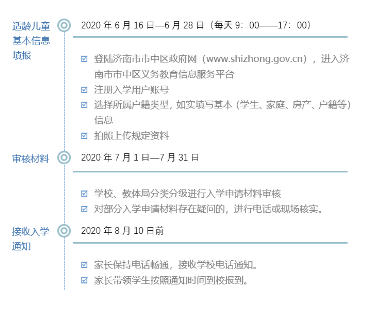 8月4日至8月5日每天9时至17时,可进入“济南市市中区义务教育信息服务平台”,进行入学材料赋分查询。8月10日前,家长电话接收安置结果。