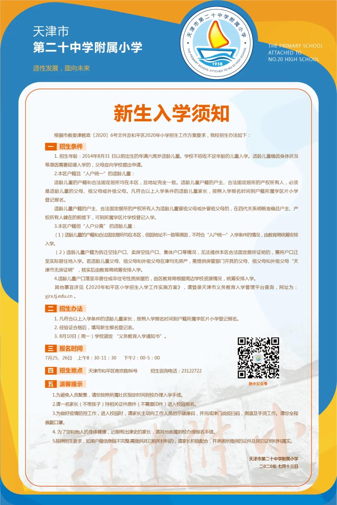 天津市和平区第二十中学附属小学2020年一年级新生招生公告