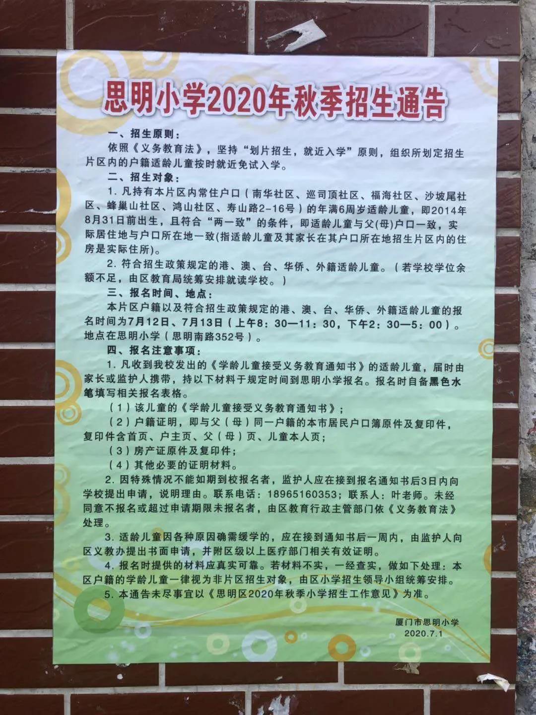 厦门市思明小学2020年秋季招生通告及招生咨询电话