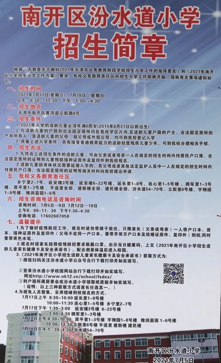 2021年天津市南开区汾水道小学招生简章,含招生咨询电话和学区范围划分