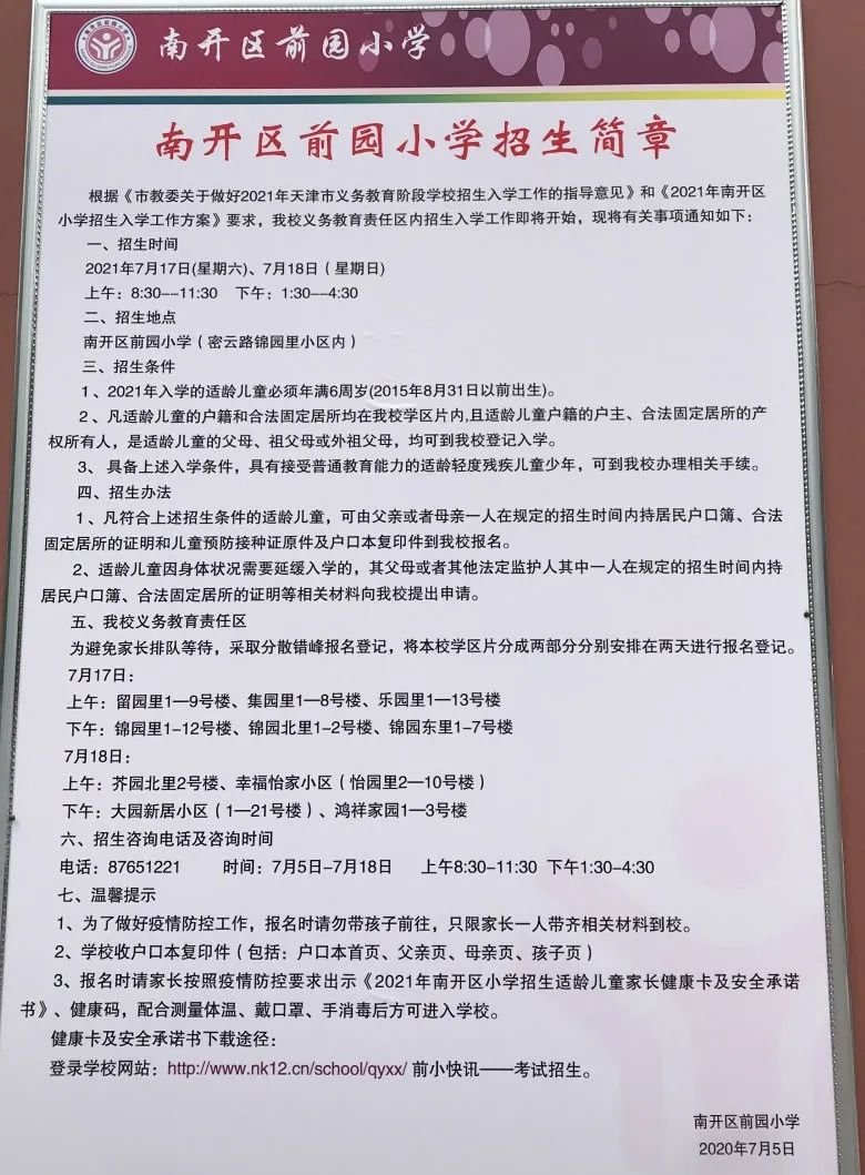 2021年天津市南开区前园小学招生简章,含招生咨询电话和学区范围划分