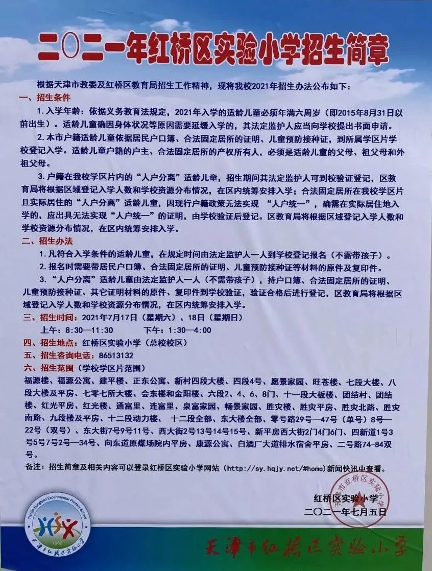 2021年天津市红桥区实验小学招生简章,含招生咨询电话和学区范围划分