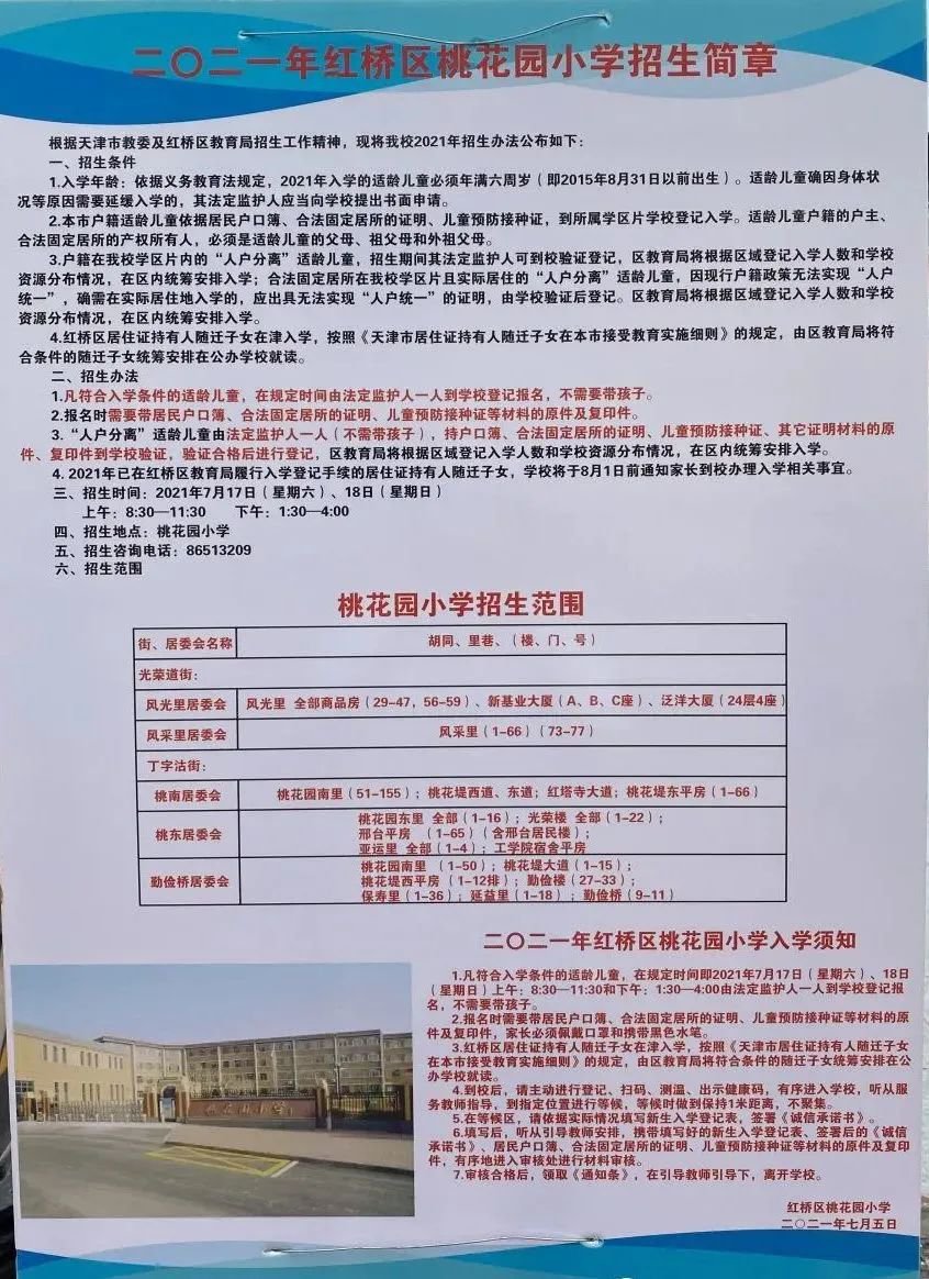 2021年天津市红桥区桃花园小学招生简章,含招生咨询电话和学区范围划分