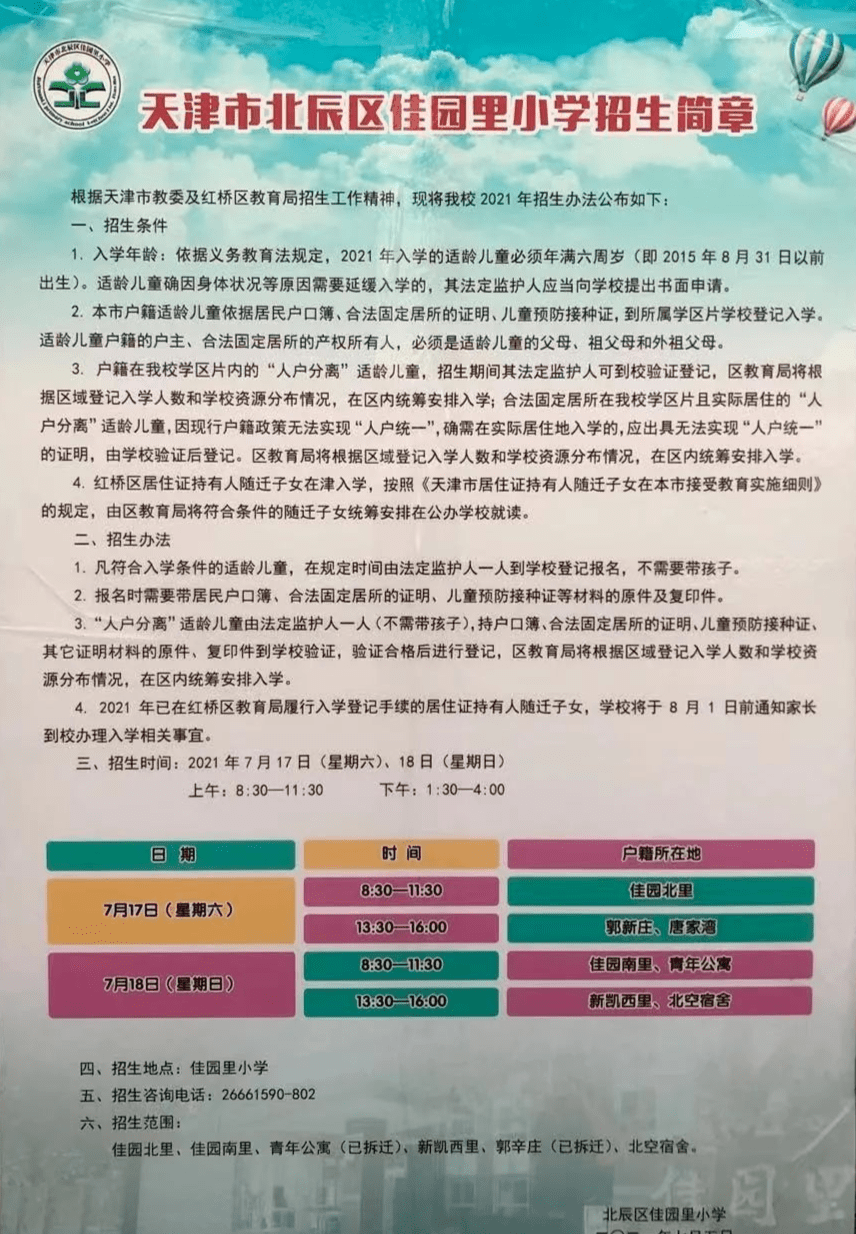 2021年天津市北辰区佳园里小学招生简章,含招生咨询电话和学区范围划分