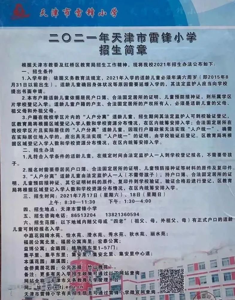 2021年天津市红桥区雷锋小学招生简章,含招生咨询电话和学区范围划分