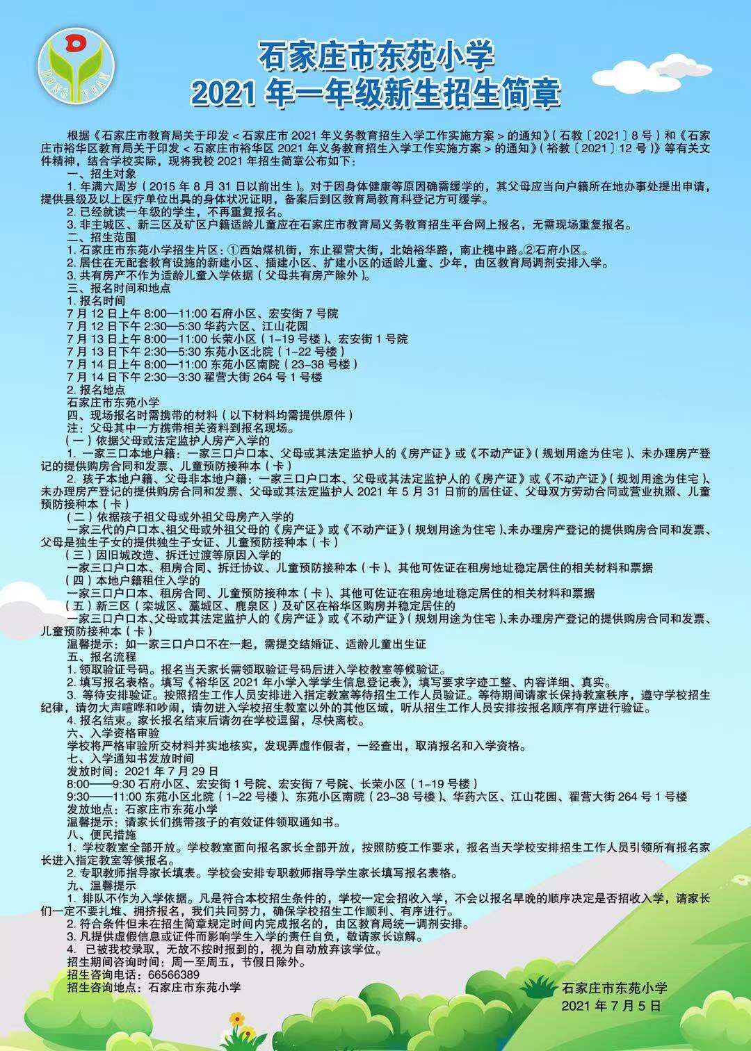 2021年石家庄市东苑小学招生简章,含招生咨询电话