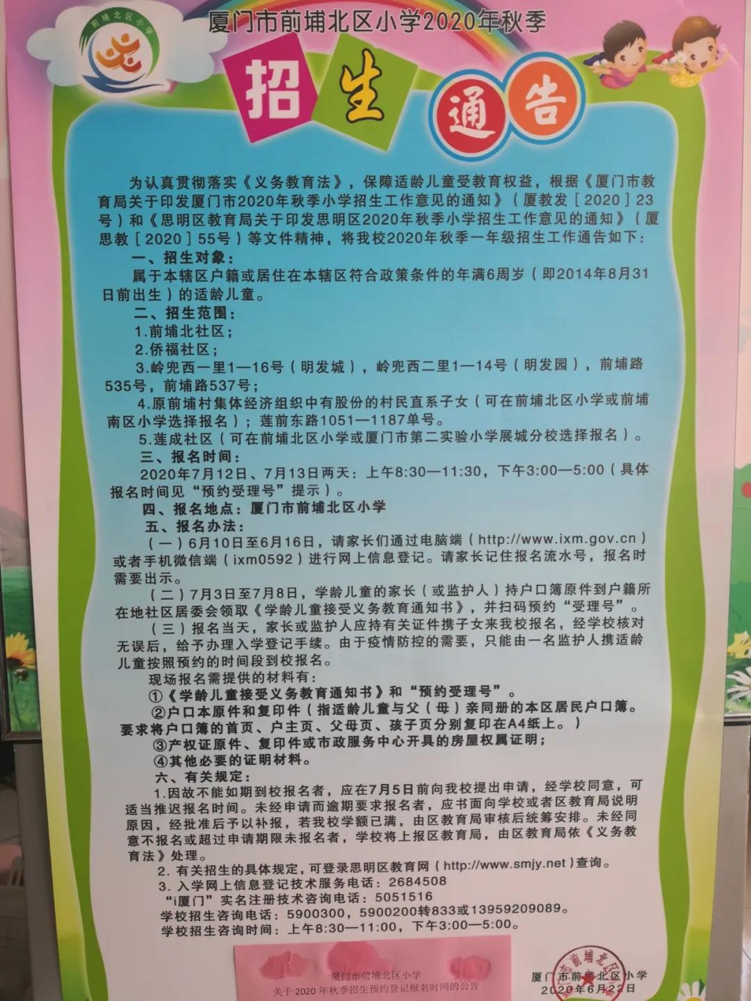 厦门市前埔北区小学2020秋季招生通告及招生咨询电话
