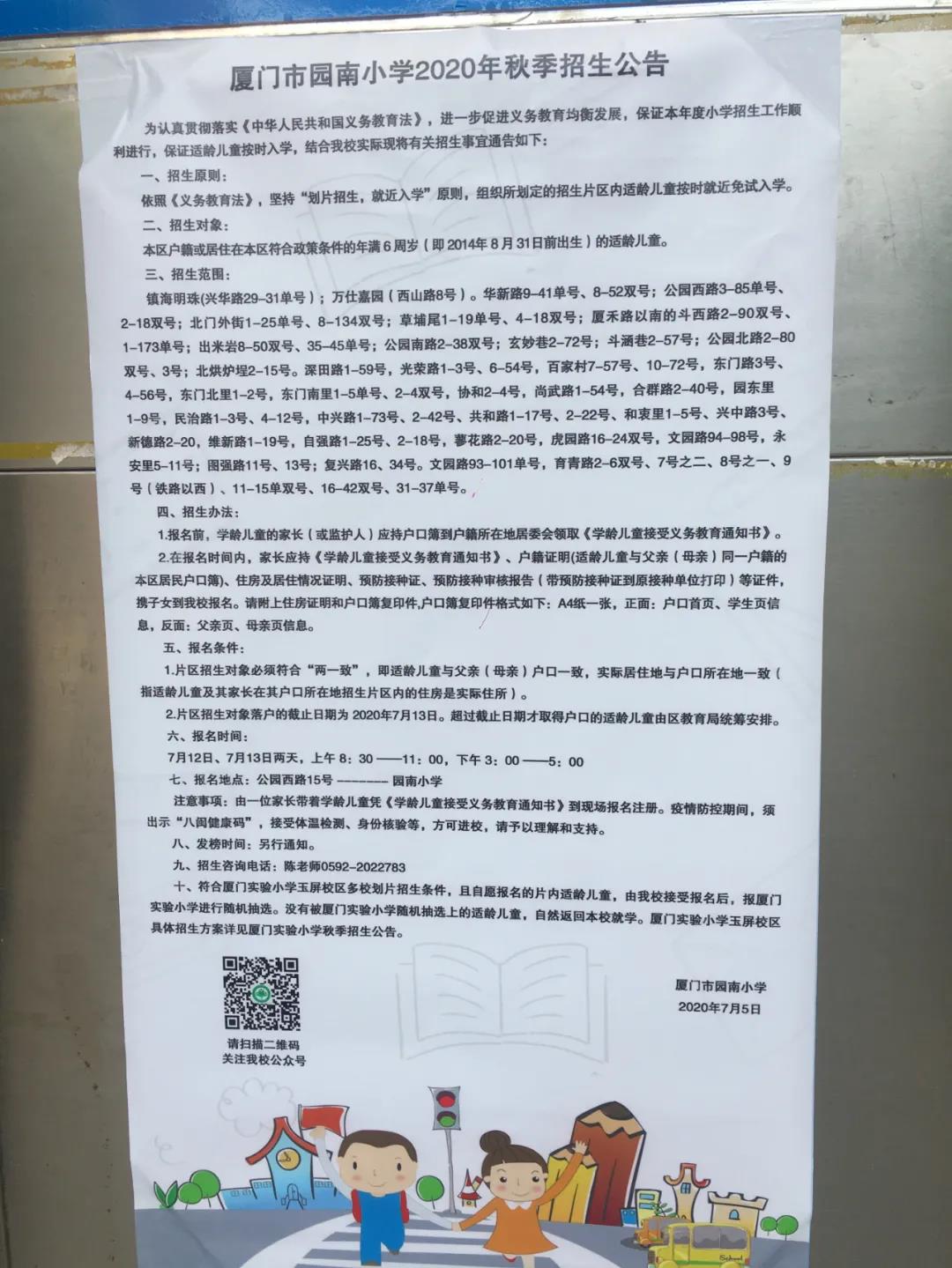 厦门市园南小学2020年秋季招生公告及招生咨询电话