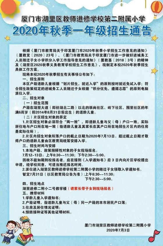 厦门市湖里区教师进修学校第二附属小学2020年秋季一年级招生通告