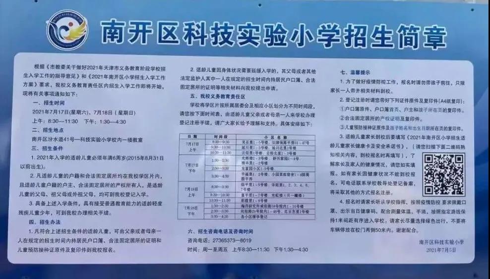 2021年天津市南开区科技实验小学招生简章,含招生咨询电话和学区范围划分