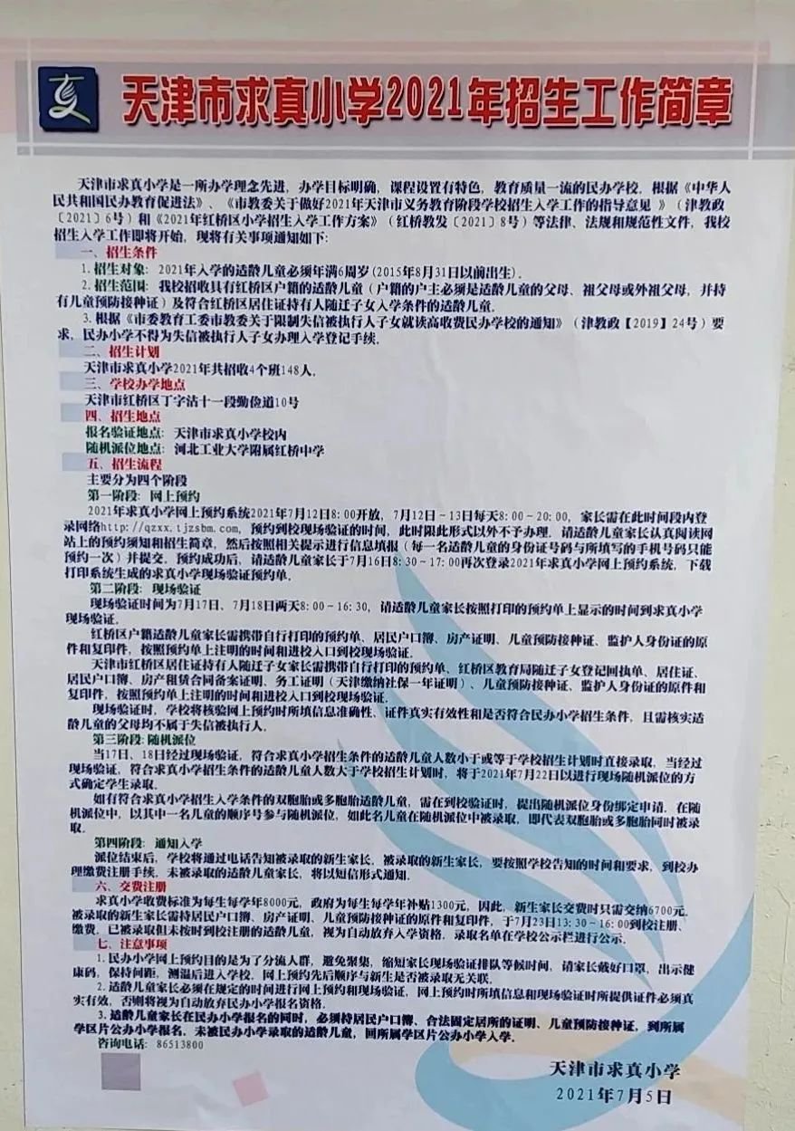 2021年天津市红桥区求真小学招生简章,含招生咨询电话和学区范围划分