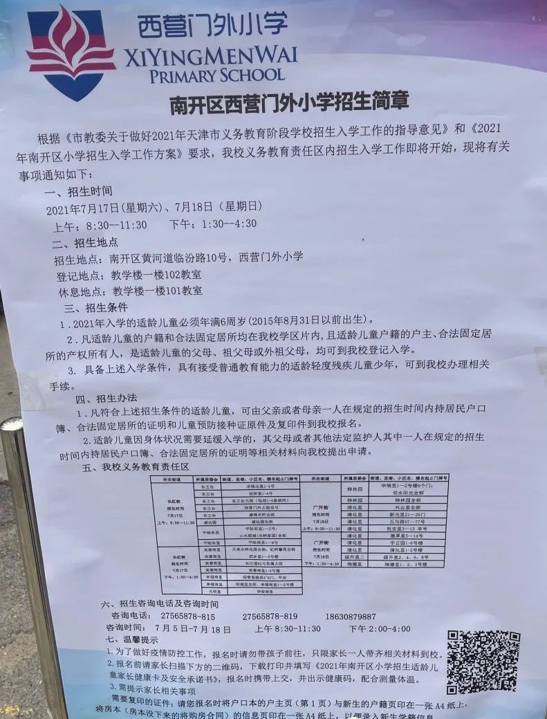 2021年天津市南开区西营门外小学招生简章,含招生咨询电话和学区范围划分