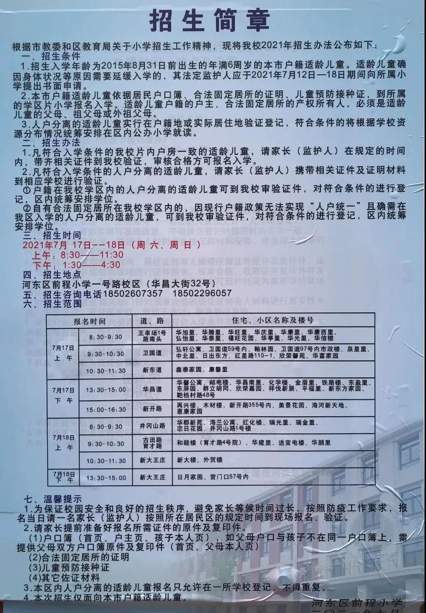 2021年天津市河东区前程小学招生简章,含招生咨询电话和学区范围划分